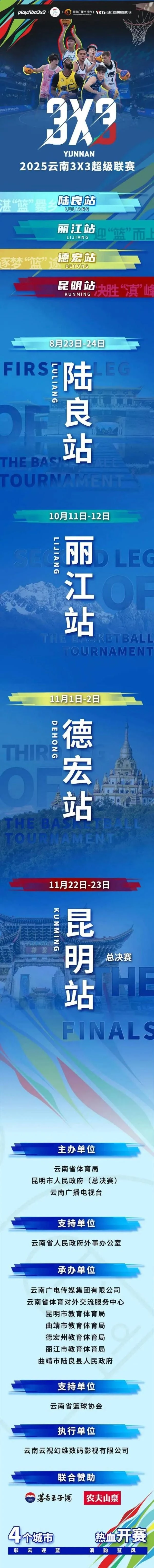10月11日至12日,2025云南3X3超级篮球联赛丽江站比赛将于束河古镇四方听音广场举行。
