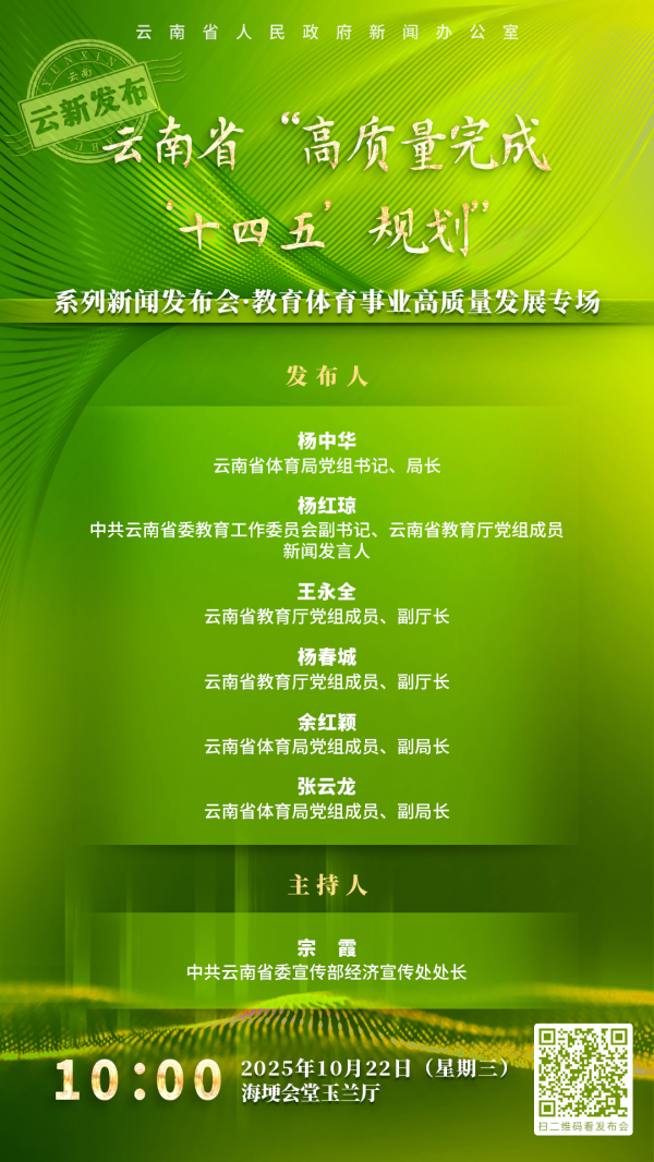 10月22日上午,云南省人民政府新闻办公室在云南海埂会堂,举行云南省“高质量完成‘十四五’规划”系列新闻发布会·教育体育事业高质量发展专场,介绍有关工作情况并回答记者提问。