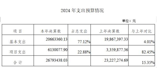 与上年相比,支出合计增加3566163.34元,增长15.35%。其中:基本支出增加795962.80元,增长4.01%;项目支出增加2770200.54元,增长82.45%;无上缴上级支出;无经营支出;无对附属单位补助支出。主要原因是2024年按照过紧日子要求,严格控制支出,公用经费开支较上年减少,由于绩效工资额度增加,支付体电所改制前离退休人员经费,导致人员费用较上年增加,同时,2024年度财政拨款项目及使用资金较上年增加,导致财政支出较上年大幅度增加。