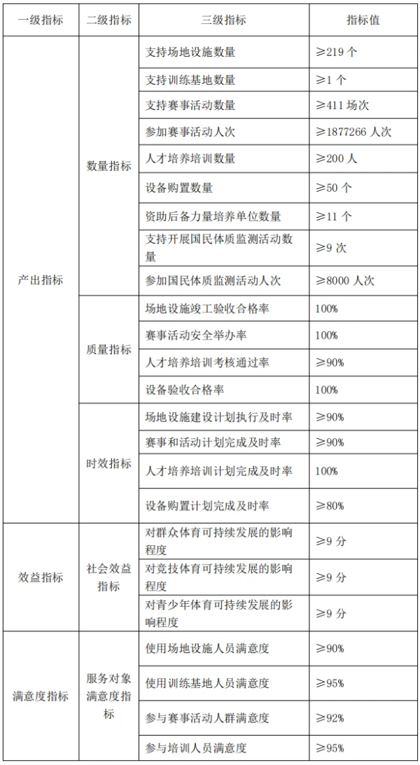 场地设施竣工验收合格率100%,实际完成100%;赛事活动安全举办率100%,实际完成100%;人才培养培训考核通过率≥90%,实际完成91%。