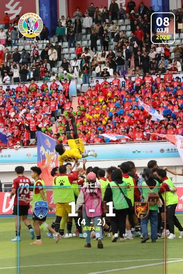 文山1-1楚雄(点球4-2)。六轮不胜的文山队此役主场面对楚雄队,上半场比赛,双方互有攻守,但均未能取得进球;下半场第54分钟,文山队11号吴嘉怀破门为主队取得领先,第81分钟,楚雄队18号沈磊取得进球帮助客队扳平比分。常规时间双方战至1-1平,比赛进入点球决胜。点球大战中,文山队以4-2战胜楚雄队,球队也终于在滇超联赛第七轮取得了首场胜利。